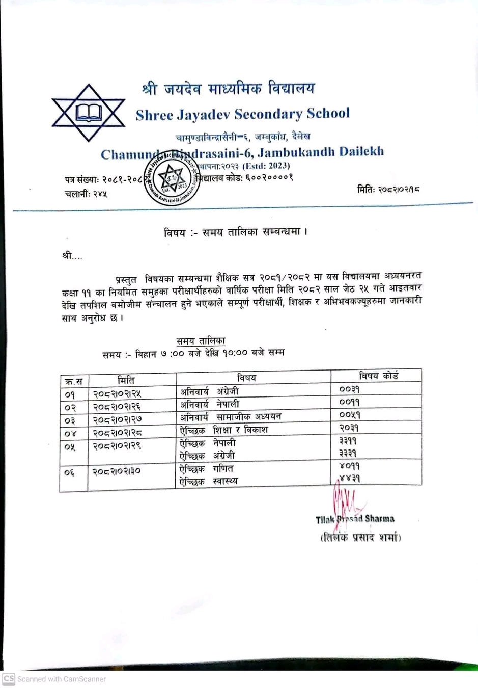 पञ्चकोशी संवाददाता। दैलेख श्री जयदेव माध्यमिक विद्यालय, चामुण्डाबिन्द्रासैनी–६, जम्बुकाँध दैलेखले शैक्षिक सत्र २०८१/८२ मा अध्ययनरत कक्षा ११ का विद्यार्थीहरूका लागि वार्षिक परीक्षा तालिका सार्वजनिक गरेको छ।